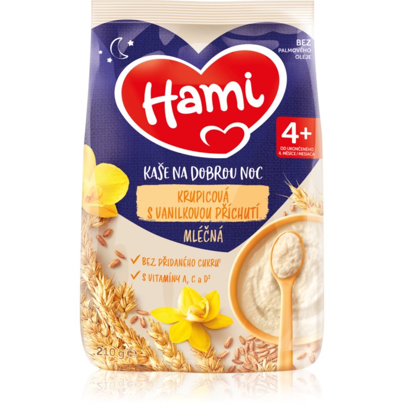 Hami - v príkrmoch sme s vami. Obilniny sú dôležitou súčasťou zdravej a pestrej stravy preto by nemali chýbať v každodennom jedálničku vášho dieťaťa. Pri prechode z mlieka na tuhú stravu sú kaše skvelou voľbou napríklad na raňajky aby vaše dieťa získalo energiu na celý ďalší deň plný nových objavov. Hami kaše sú vyrobené zo starostlivo kontrolovaných obilnín ktoré sú prirodzeným zdrojom energie. Obsahujú tiež dôležité vitamíny a minerály. Navyše kaše Hami skvele chutia a dobre sa rozpúšťajú! Mliečne kaše Hami pozostávajú aj zo starostlivo vybraného mlieka a možno aj ovocia ktoré sa zbiera v optimálnom čase zrelosti suší sa a spracováva na vločky alebo ovocný prášok ktorý sa potom zmieša s kašou aby bola plná rozmanitých chutí a vôní. Vieme že výživa dieťaťa počas prvých 1000 dní života zohráva kľúčovú úlohu pre jeho zdravie v dospelosti takže s kašou Hami si môžete byť istí že vaše dieťa dostáva správnu výživu. Hami mliečna kaša krupicová s vanilkovou príchuťou na dobrú noc je vhodná ako chutná večera alebo raňajky pre malé brušká. Obsahuje obilniny (pšeničnú krupicu) ktorá je prirodzeným zdrojom energie na dobrodružný deň. Jedna porcia kaše denne tak pomáha postupne- Už obsahuje starostlivo vybrané mlieko- Neobsahuje palmový olej- Vybrané a kontrolované obilniny pre malé brušká- Obsahuje vitamín D a vápnik ako to vyžaduje legislatíva pre normálny rast a vývoj kostí- 100% bez konzervačných látok a farbív ako to vyžaduje zákon- Kvalita pre dojčatá** Obsahuje vitamíny A C a D ktoré prispievajú k normálnej funkcii imunitného systému vitamín D a vápnik potrebný pre normálny rast a vývoj kostí dojčiat. Vitamíny A D a vápnik v súlade s požiadavkami právnych predpisov. Zloženie: Pšeničná krupica 9 % pšeničná múka 9 % sušené odtučnené mlieko 5 3 % demineralizovaná srvátka (z mlieka) rastlinné oleje (slnečnicový repkový slnečnicový s vysokým obsahom kyseliny olejovej kokosový) minerálne látky (uhličitan vápenatý difosforečnan železitý jodid draselný) prírodná vanilková aróma vitamíny (kyselina L-askorbová - vit. C DL-α-tokoferylacetát - vit. E retinylacetát - vit. A cholekalciferol - vit. D D-biotín tiamín mononitrát - vit. B pyridoxín hydrochlorid - vit. B). Môže obsahovať stopy horčice. Zloženie sa vzťahuje k sušenému stavu potraviny.