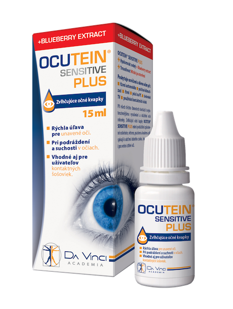 Da Vinci Academia Ocutein Sensitive Plus 15 ml Podráždené a suché oči pre mužov Očné kvapky OCUTEIN® SENSITIVE PLUS sú sterilné kvapky s hyaluronátom sodným a extraktom z čučoriedok s vysoko účinným upokojujúcim lubrikačným a hydratačným účinkom. Aplikácia je možná priamo na nasadené kontaktné šošovky. Sú vhodné aj pre veľmi citvivé oči. Poskytuje osvieženie a úľavu očiam pri riadení automobilu aktívnej klimatizácii čítaní – práci na počítači sledovaní televízie používaní kontaktných šošoviek. zabezpečujú rýchľu úľavu pre podráždené unavené a suché oči zmierňujú pocit sucha pri celodennom nosení kontaktných šošoviek možno ich aplikovať priamo na nasadené kontaktné šošovky Spôsob použitia: Aplikujte jednu alebo dve kvapky do každého oka raz alebo viac krát za deň podľa potreby alebo odporučenia lekára. Používatelia kontaktných šošoviek aplikujú kvapky na nasadené kontaktné šošovky počas dňa podľa potreby. Je možné tiež aplikovať dve až tri kvapky na kontaktnú šošovku pred jej nasadením. Upozornenie: Použiteľné 90 dní po prvom otvorení. Výrobca/Dovozca: Simply You Pharmaceuticals a. s. Roháčova 188/37 Žižkov 130 00 Praha Česká republika